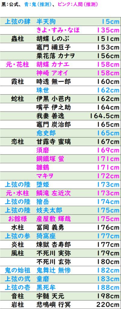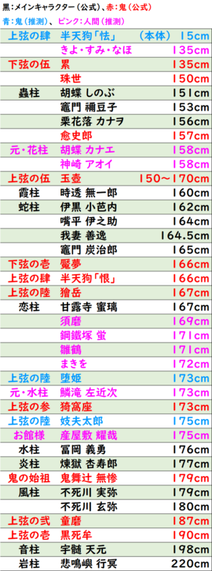 身長が公式になっている主要キャラクター(黒字)と鬼(赤字)、公式になっていない推測の身長も含め、低い順に並べてみます。